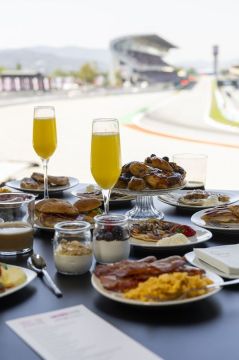 - Zugang zu 2 Terrassen: Eine Terrasse auf der gleichen Etage mit Panoramablick auf die letzte Kurve und den Eingang zur Boxengasse sowie eine Terrasse im unteren Stockwerk mit einer näheren Sicht auf die Strecke und die MotoGP-Fahrzeuge.